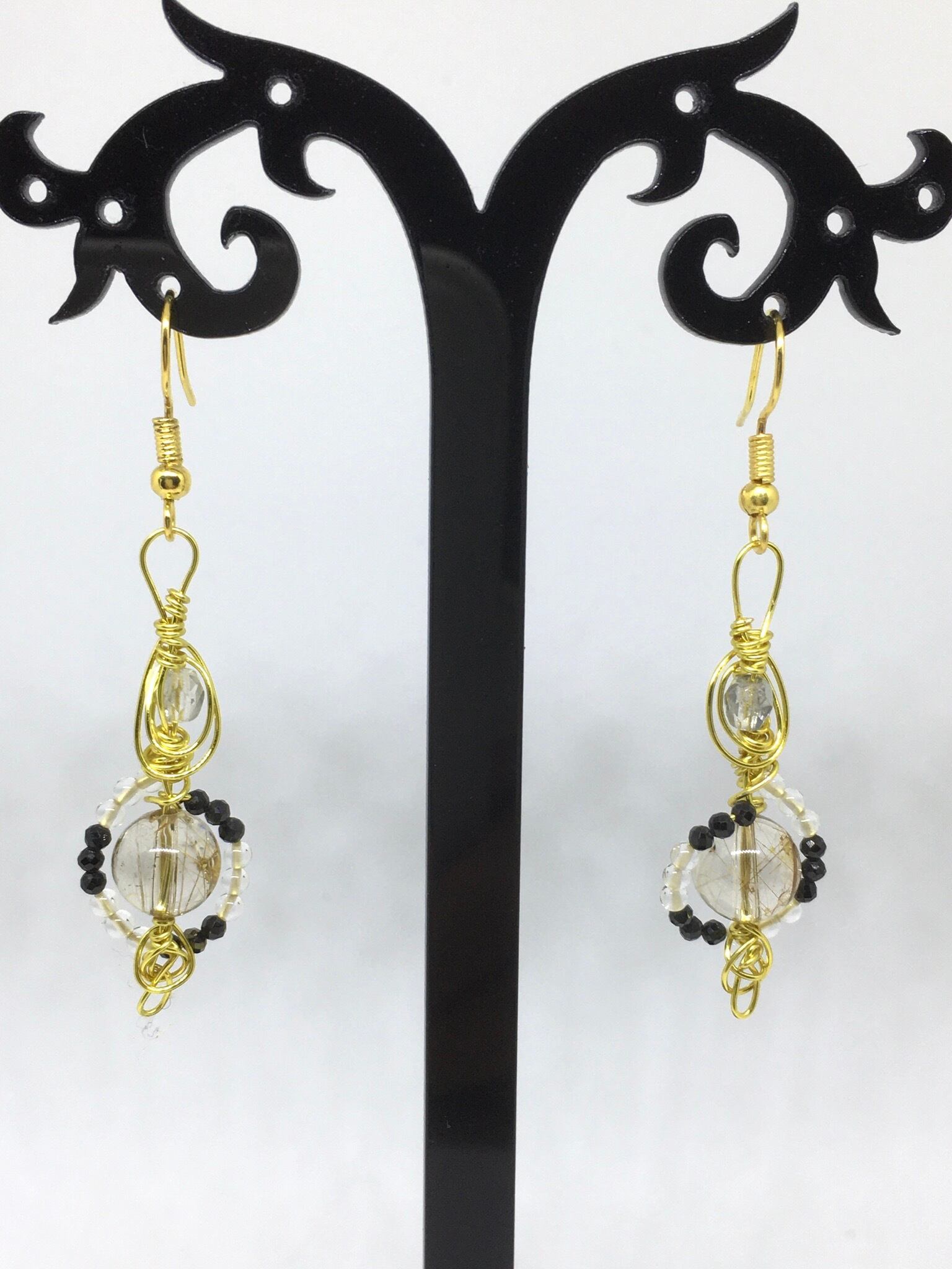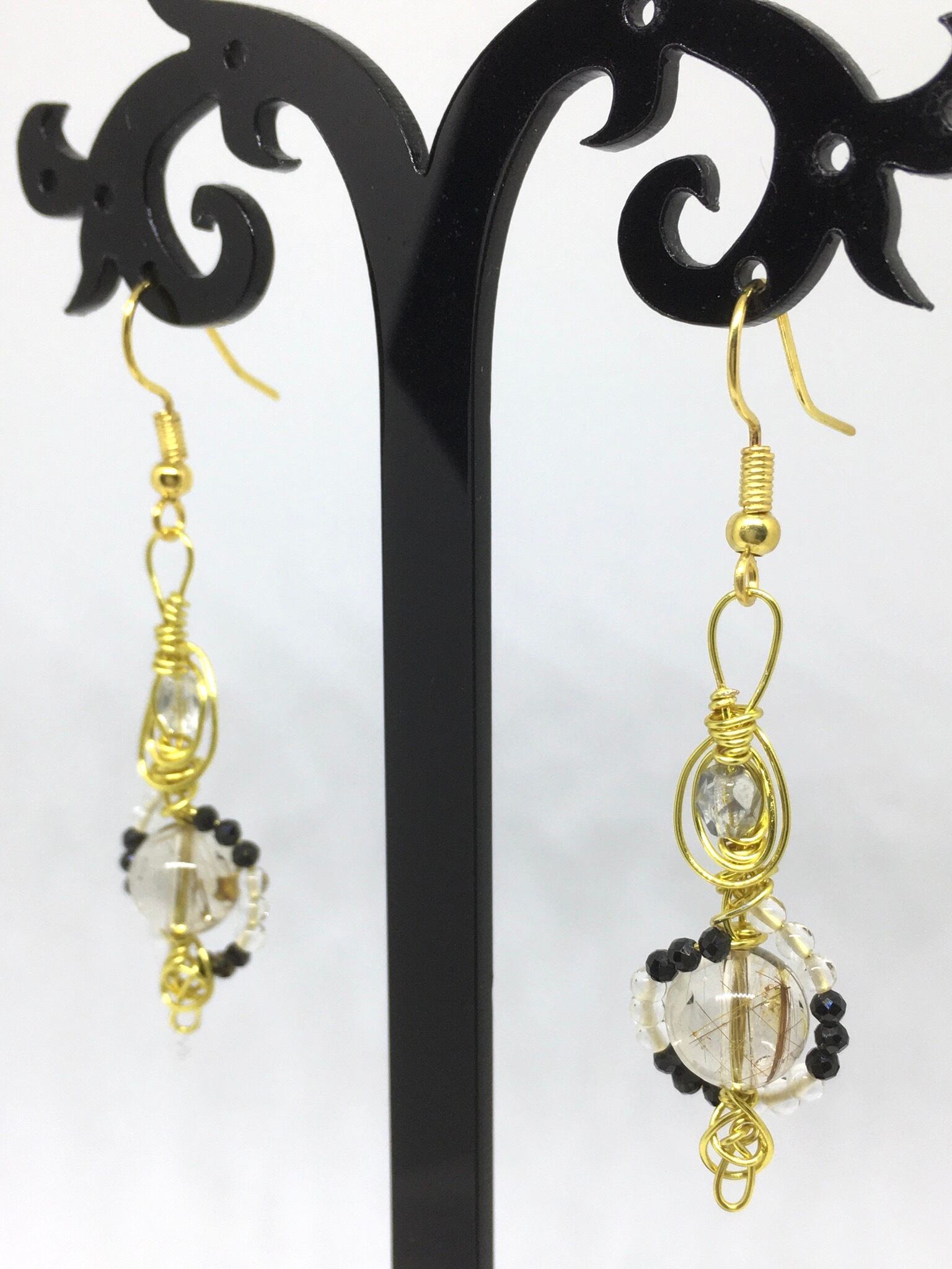 このピアスはルチルクオーツの周りにブラックスピネルとクリスタルで飾りを入れました。