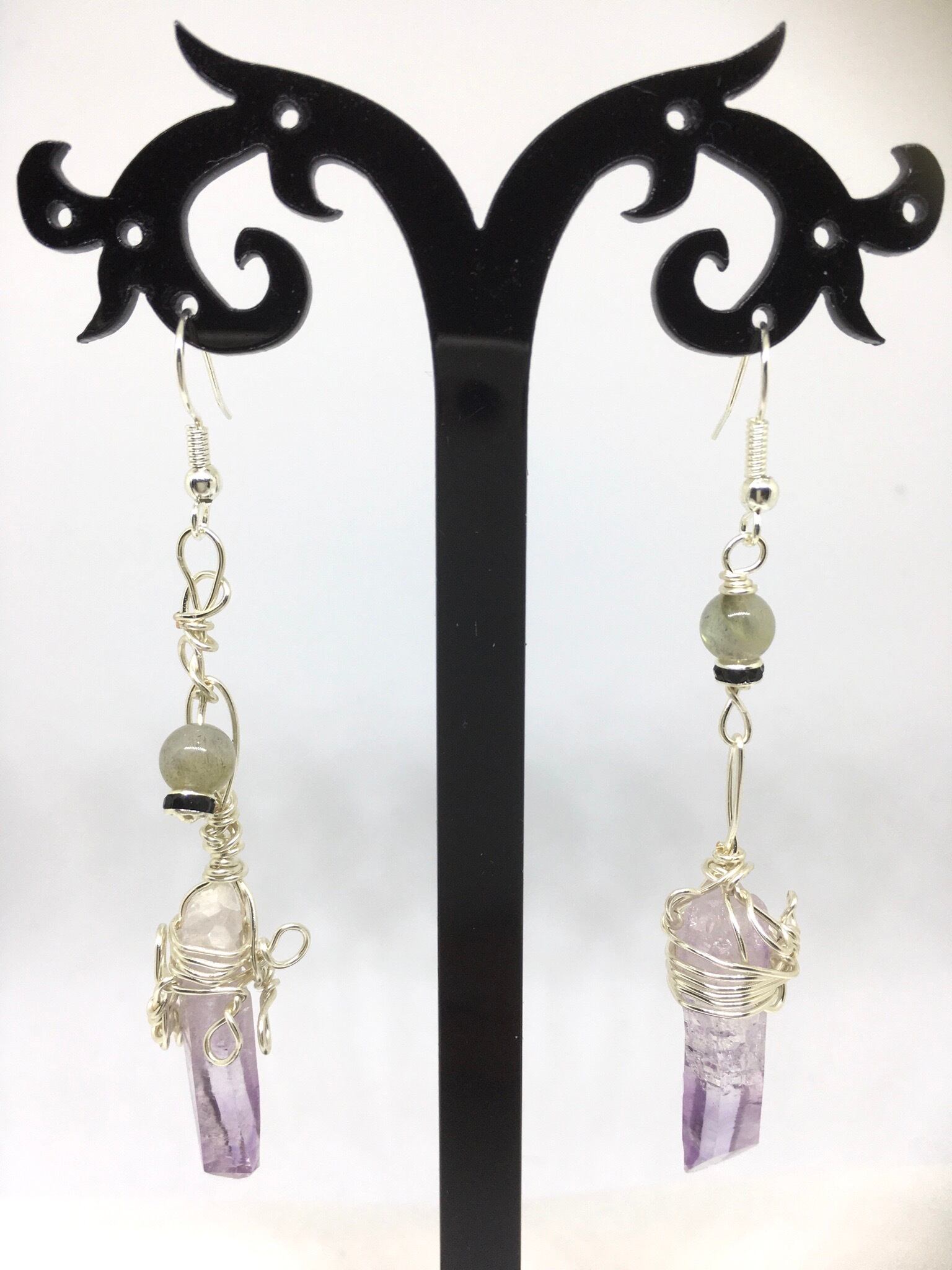 ナチュラルなアメジストのポイントとラブラドライトでアンシンメトリーのピアスを作りました。